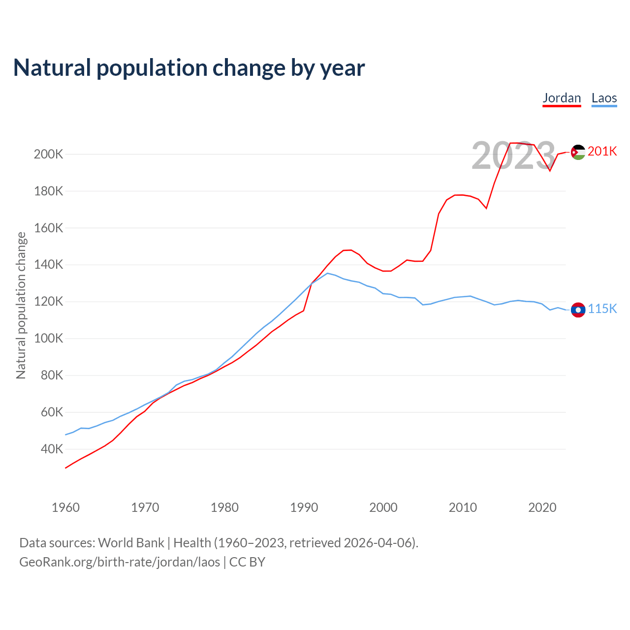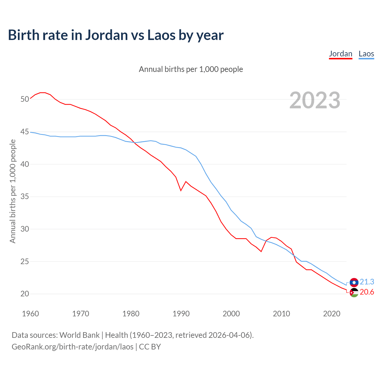 Jordan has an annual birth rate of 20.6 births per 1,000 people, compared to 21.3 for Laos. The average number of children a woman is expected to have during her lifetime — the fertility rate, is 2.64 in Jordan and 2.42 in Laos — 8.26% difference.