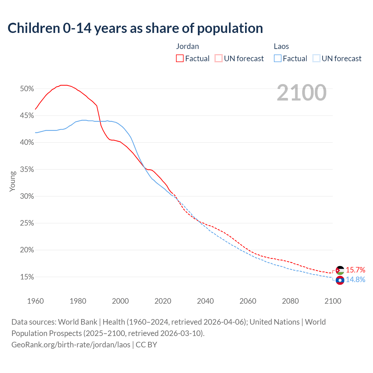 According to the latest available data on birth rates, the fertility rate in Jordan was 2.64 children per woman in 2023, compared to 2.42 in Laos in 2023. The replacement level is considered to be 2.1 children per woman.