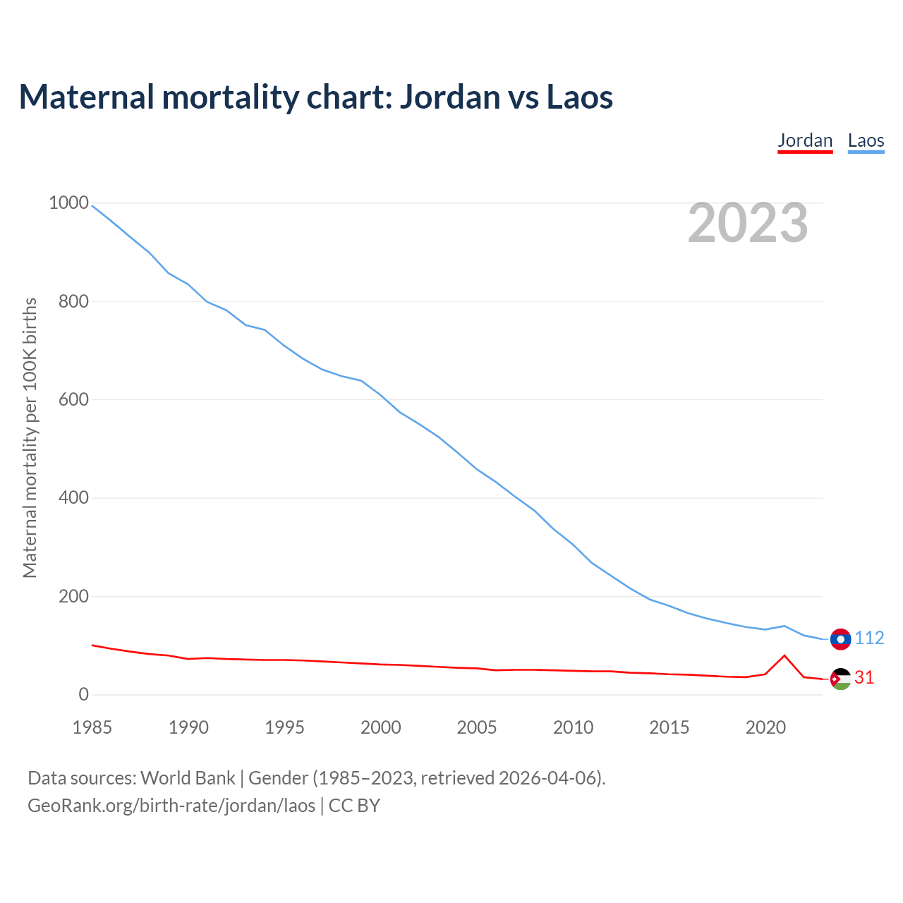 The maternal mortality rate, which is the probability of dying during childbirth or within 42 days of pregnancy termination, is 31 deaths per 100,000 live births in Jordan, compared to 112 deaths in Laos.