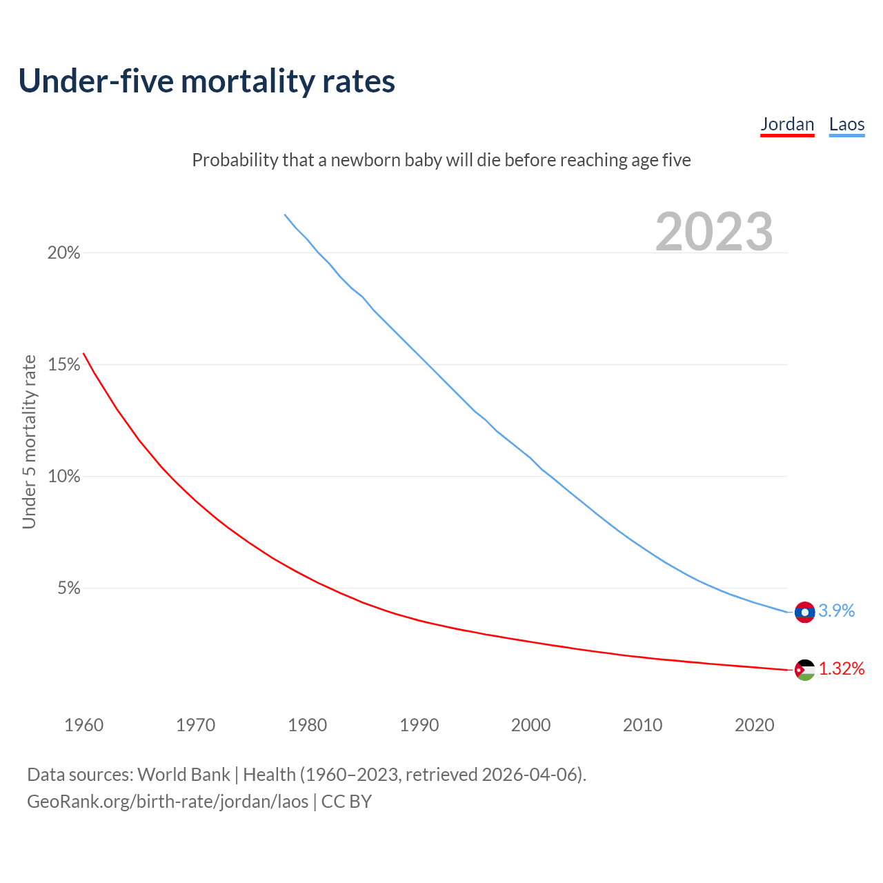 The chance that a newborn baby will die before reaching age five is 1.32% in Jordan and 3.9% in Laos. Above is a chart with historical data on under-five mortality rates.