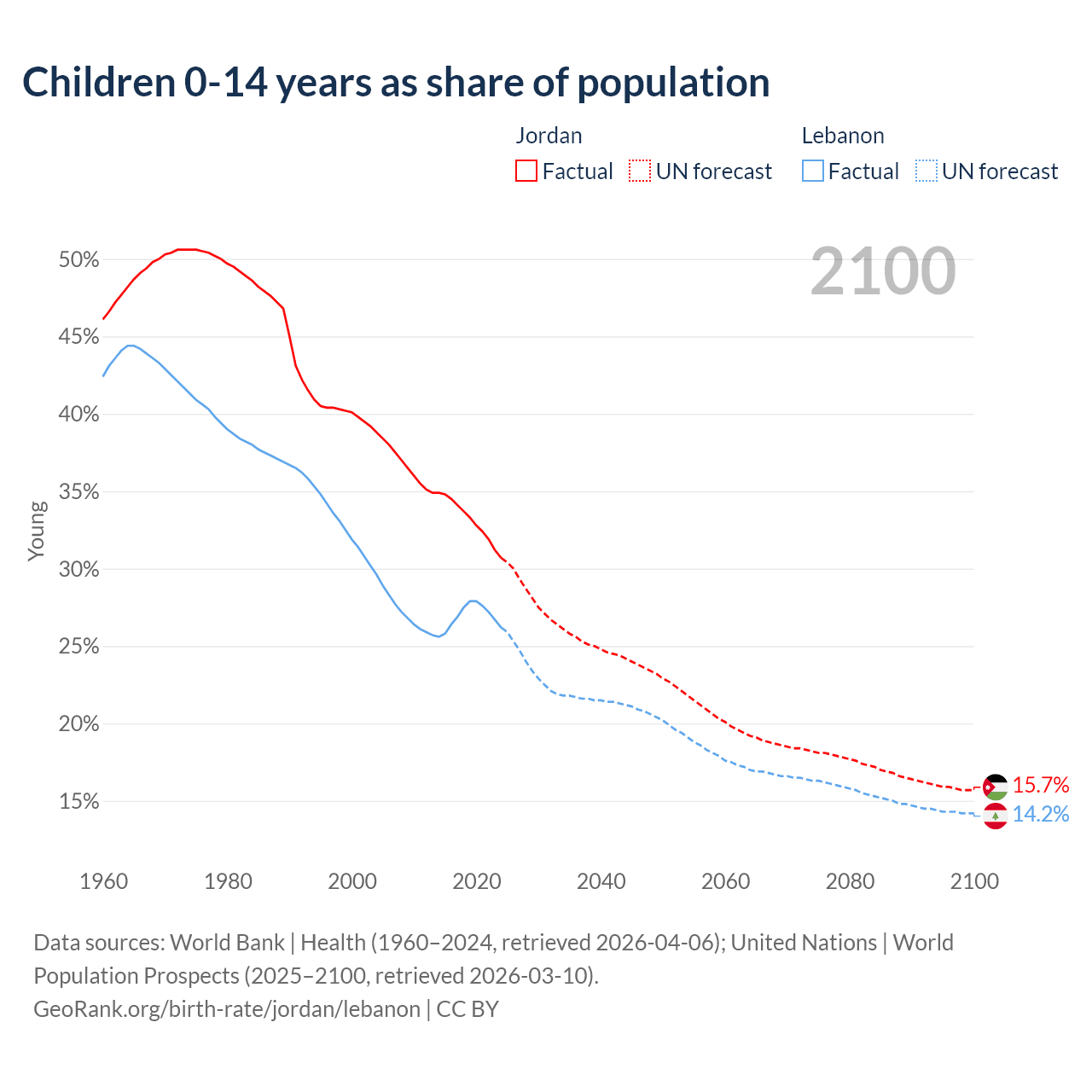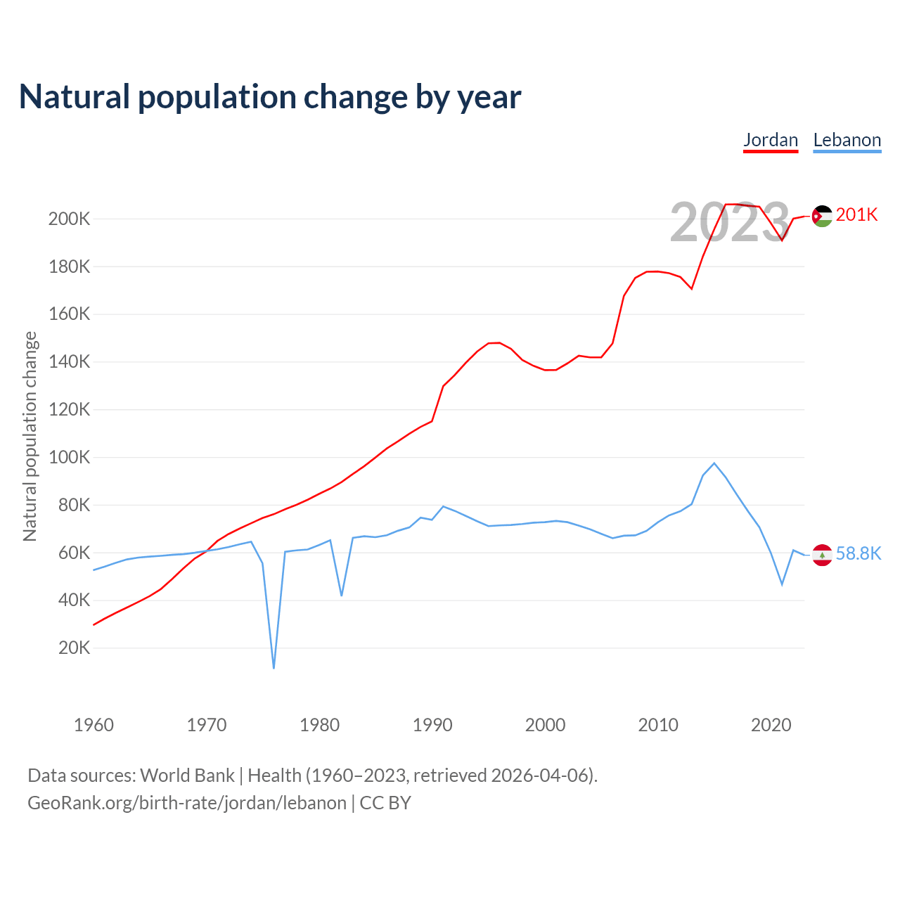 According to the latest available data on birth rates, the fertility rate in Jordan was 2.64 children per woman in 2023, compared to 2.24 in Lebanon in 2023. The replacement level is considered to be 2.1 children per woman.