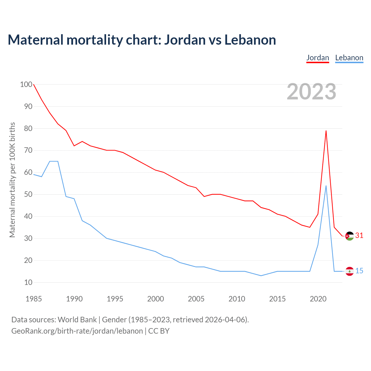 The maternal mortality rate, which is the probability of dying during childbirth or within 42 days of pregnancy termination, is 31 deaths per 100,000 live births in Jordan, compared to 15 deaths in Lebanon.