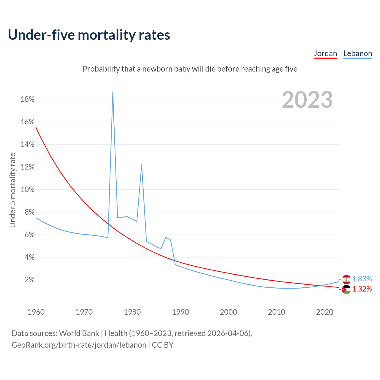 The chance that a newborn baby will die before reaching age five is 1.32% in Jordan and 1.83% in Lebanon. Above is a chart with historical data on under-five mortality rates.