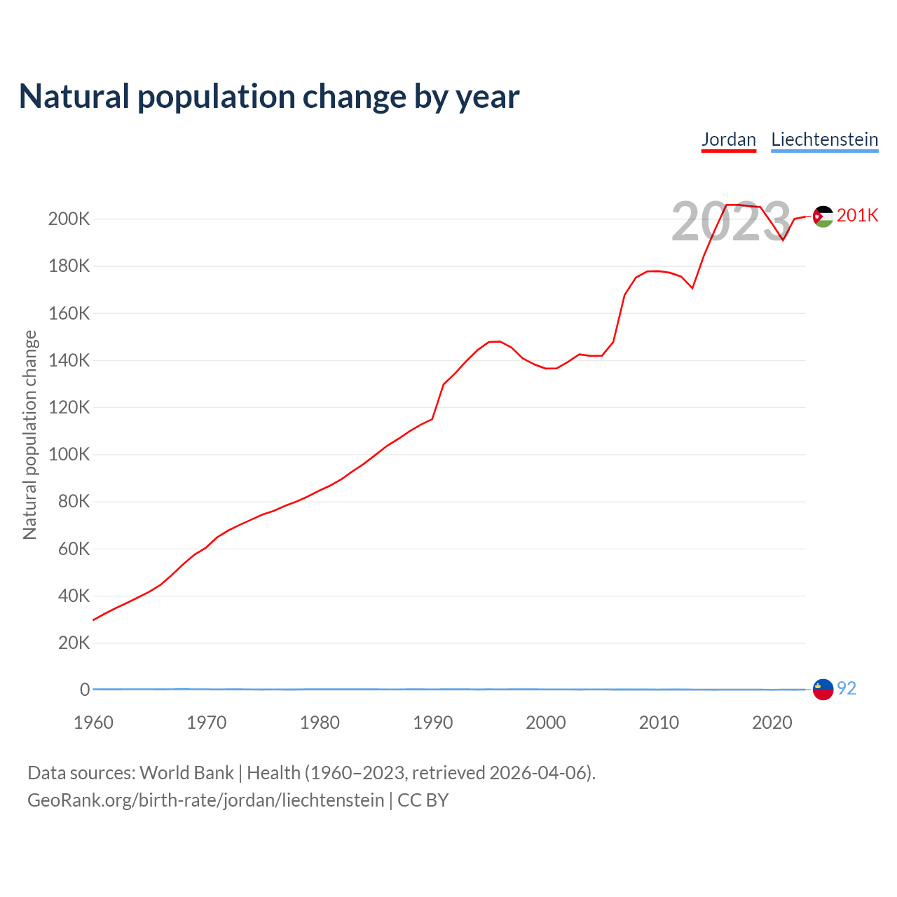 According to the latest available data on birth rates, the fertility rate in Jordan was 2.64 children per woman in 2023, compared to 1.45 in Liechtenstein in 2023. The replacement level is considered to be 2.1 children per woman.