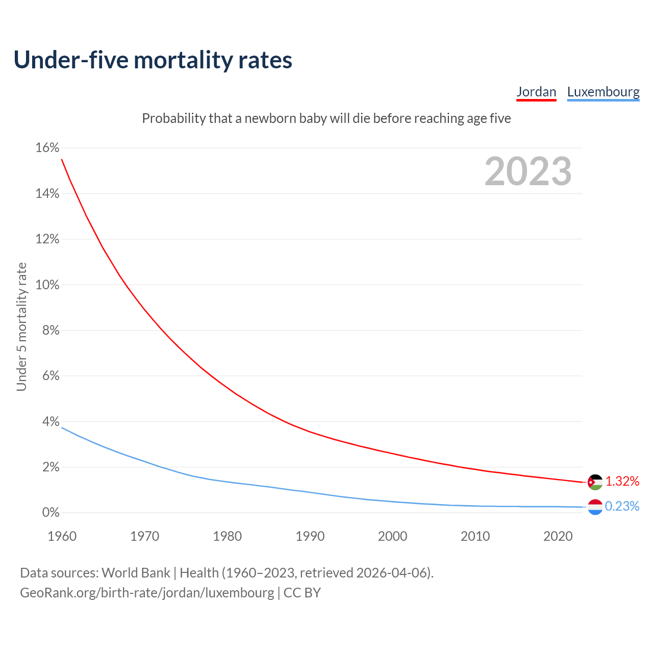 The chance that a newborn baby will die before reaching age five is 1.32% in Jordan and 0.23% in Luxembourg. Above is a chart with historical data on under-five mortality rates.