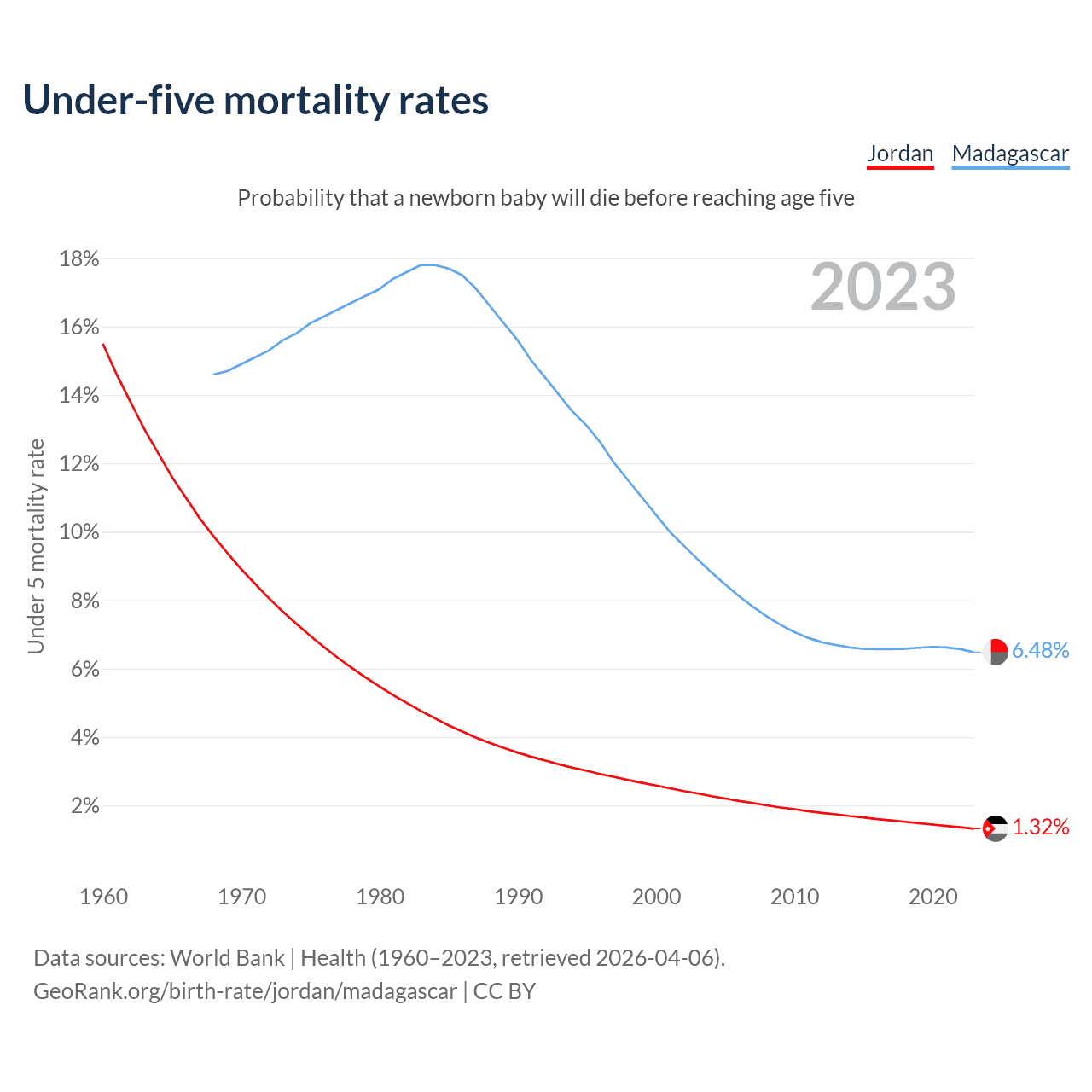 The chance that a newborn baby will die before reaching age five is 1.32% in Jordan and 6.48% in Madagascar. Above is a chart with historical data on under-five mortality rates.