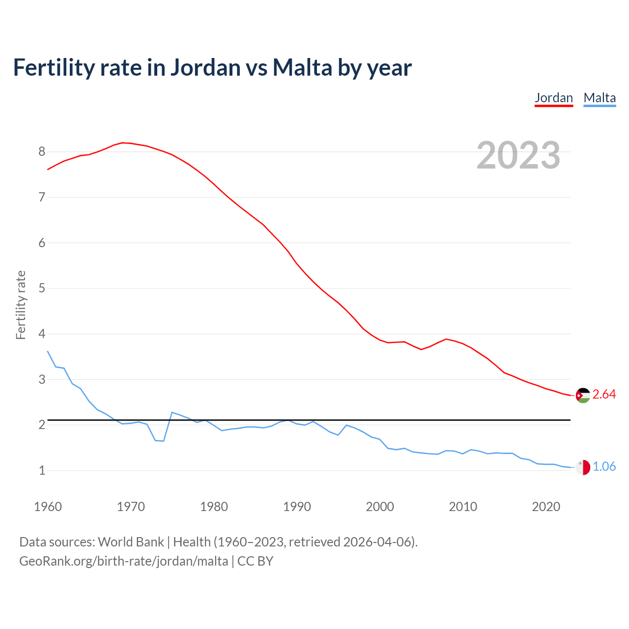 1960 vs 2023, the fertility rate has decreased by 65.3% in Jordan and by 70.7% in Malta — in 1960, it was 7.6 and 3.62, respectively.