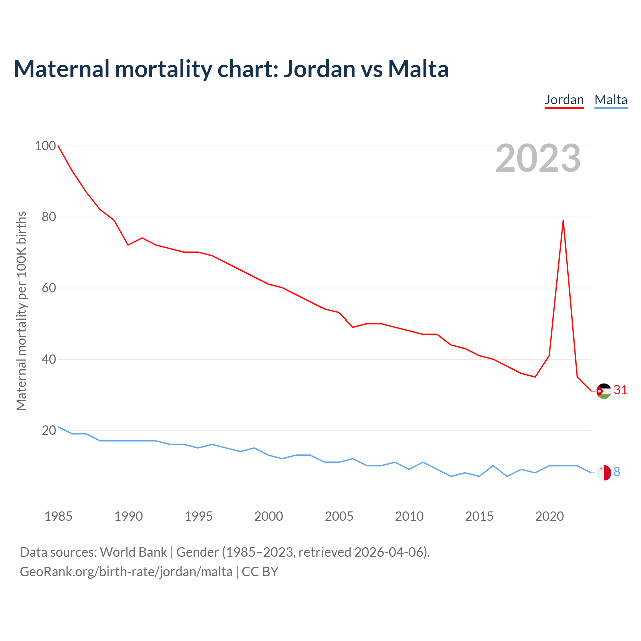 The maternal mortality rate, which is the probability of dying during childbirth or within 42 days of pregnancy termination, is 31 deaths per 100,000 live births in Jordan, compared to 8 deaths in Malta.