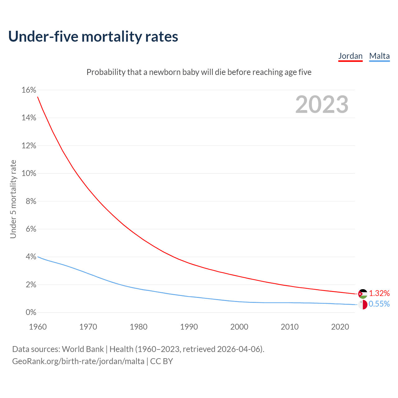 The chance that a newborn baby will die before reaching age five is 1.32% in Jordan and 0.55% in Malta. Above is a chart with historical data on under-five mortality rates.