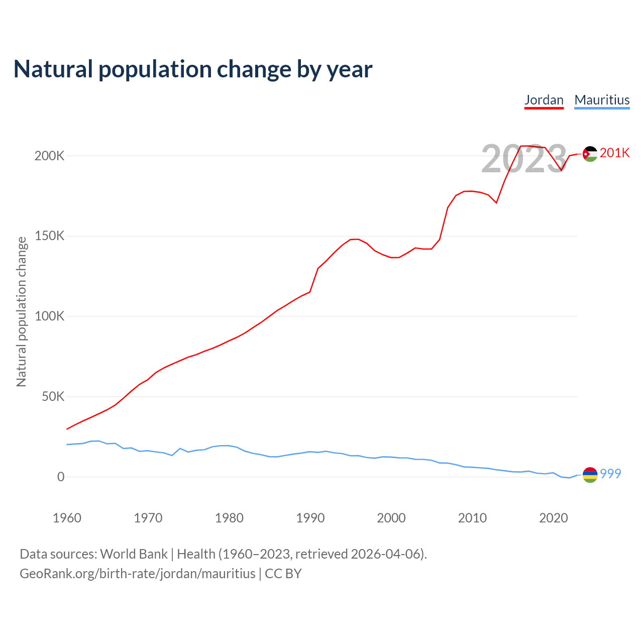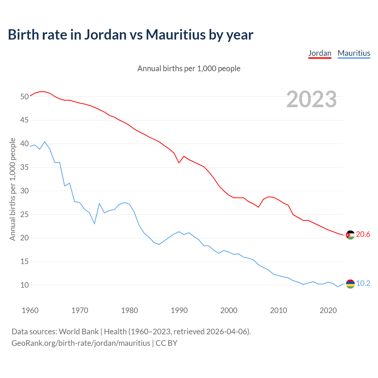 Jordan has an annual birth rate of 20.6 births per 1,000 people, compared to 10.2 for Mauritius. The average number of children a woman is expected to have during her lifetime — the fertility rate, is 2.64 in Jordan and 1.39 in Mauritius — 47.3% difference.