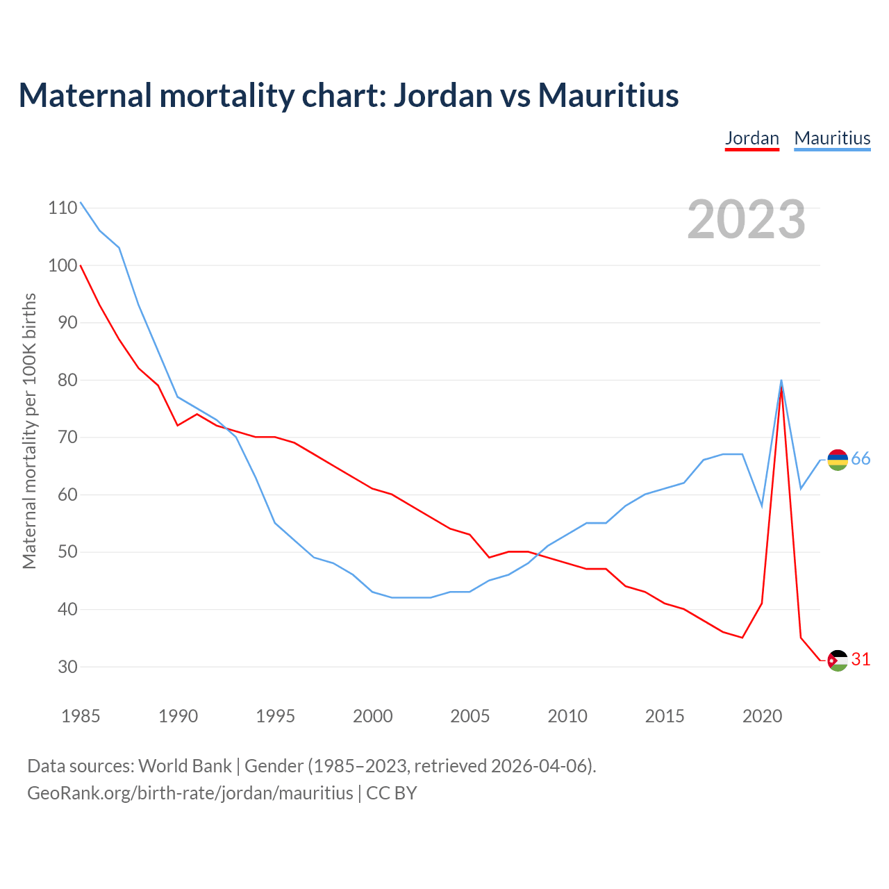 The maternal mortality rate, which is the probability of dying during childbirth or within 42 days of pregnancy termination, is 31 deaths per 100,000 live births in Jordan, compared to 66 deaths in Mauritius.