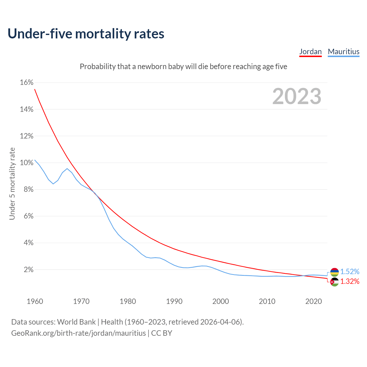 The chance that a newborn baby will die before reaching age five is 1.32% in Jordan and 1.52% in Mauritius. Above is a chart with historical data on under-five mortality rates.