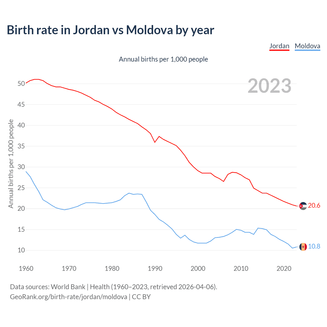 Jordan has an annual birth rate of 20.6 births per 1,000 people, compared to 10.8 for Moldova. The average number of children a woman is expected to have during her lifetime — the fertility rate, is 2.64 in Jordan and 1.73 in Moldova — 34.4% difference.
