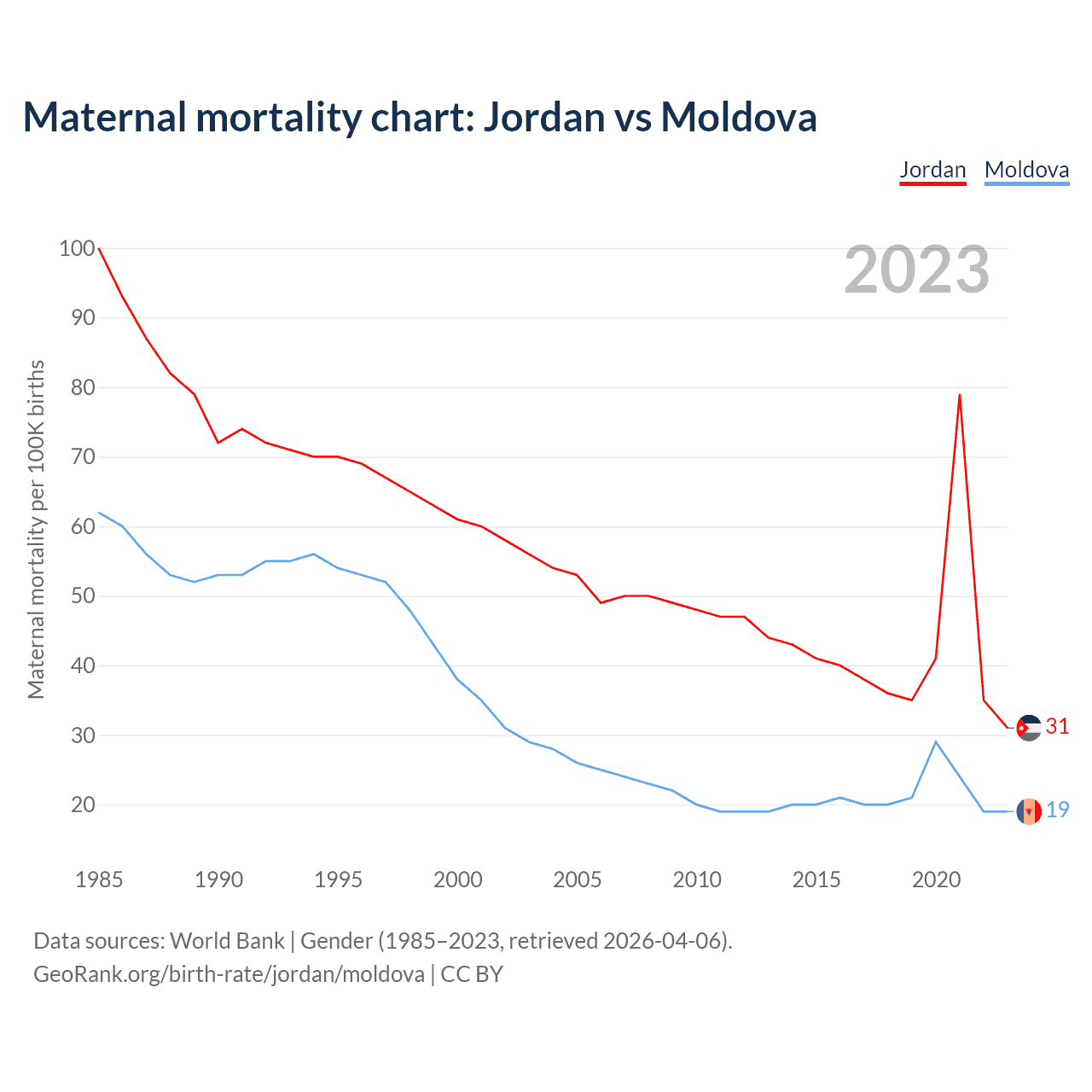 The maternal mortality rate, which is the probability of dying during childbirth or within 42 days of pregnancy termination, is 31 deaths per 100,000 live births in Jordan, compared to 19 deaths in Moldova.