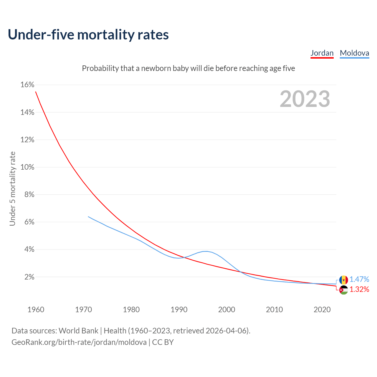 The chance that a newborn baby will die before reaching age five is 1.32% in Jordan and 1.47% in Moldova. Above is a chart with historical data on under-five mortality rates.