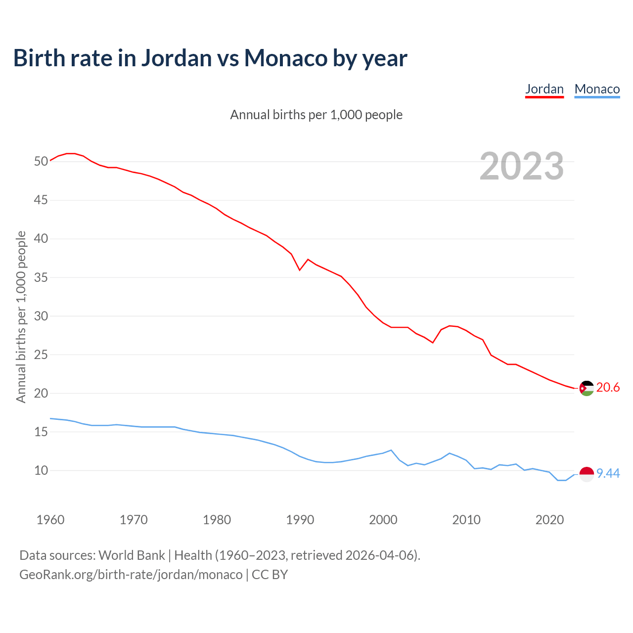Jordan has an annual birth rate of 20.6 births per 1,000 people, compared to 9.44 for Monaco. The average number of children a woman is expected to have during her lifetime — the fertility rate, is 2.64 in Jordan and 2.11 in Monaco — 20% difference.