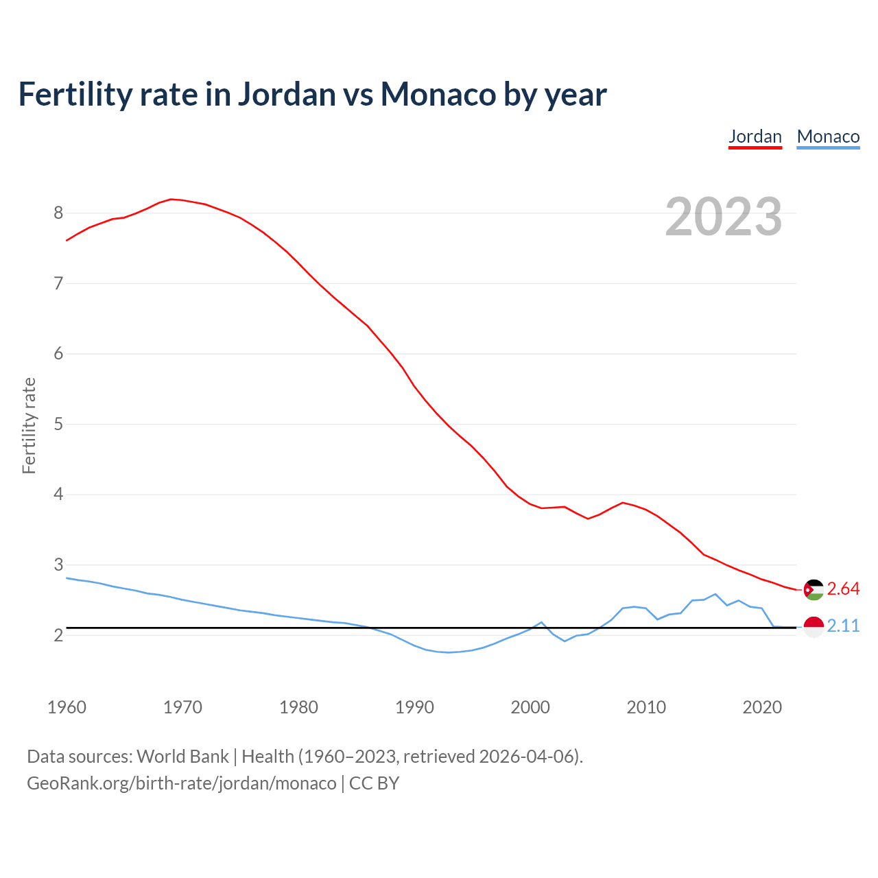 According to the latest available data on birth rates, the fertility rate in Jordan was 2.64 children per woman in 2023, compared to 2.11 in Monaco in 2023. The replacement level is considered to be 2.1 children per woman.
