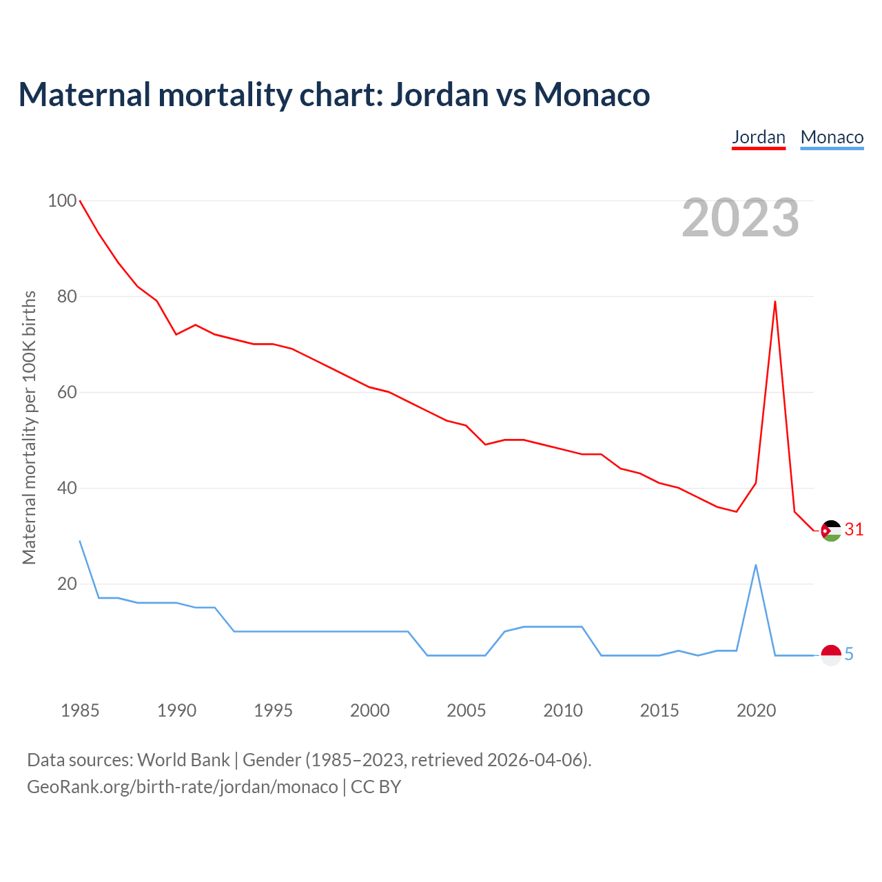 The maternal mortality rate, which is the probability of dying during childbirth or within 42 days of pregnancy termination, is 31 deaths per 100,000 live births in Jordan, compared to 5 deaths in Monaco.