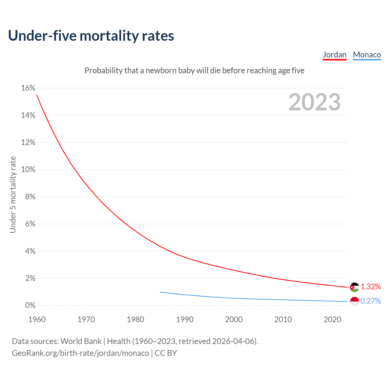 The chance that a newborn baby will die before reaching age five is 1.32% in Jordan and 0.27% in Monaco. Above is a chart with historical data on under-five mortality rates.