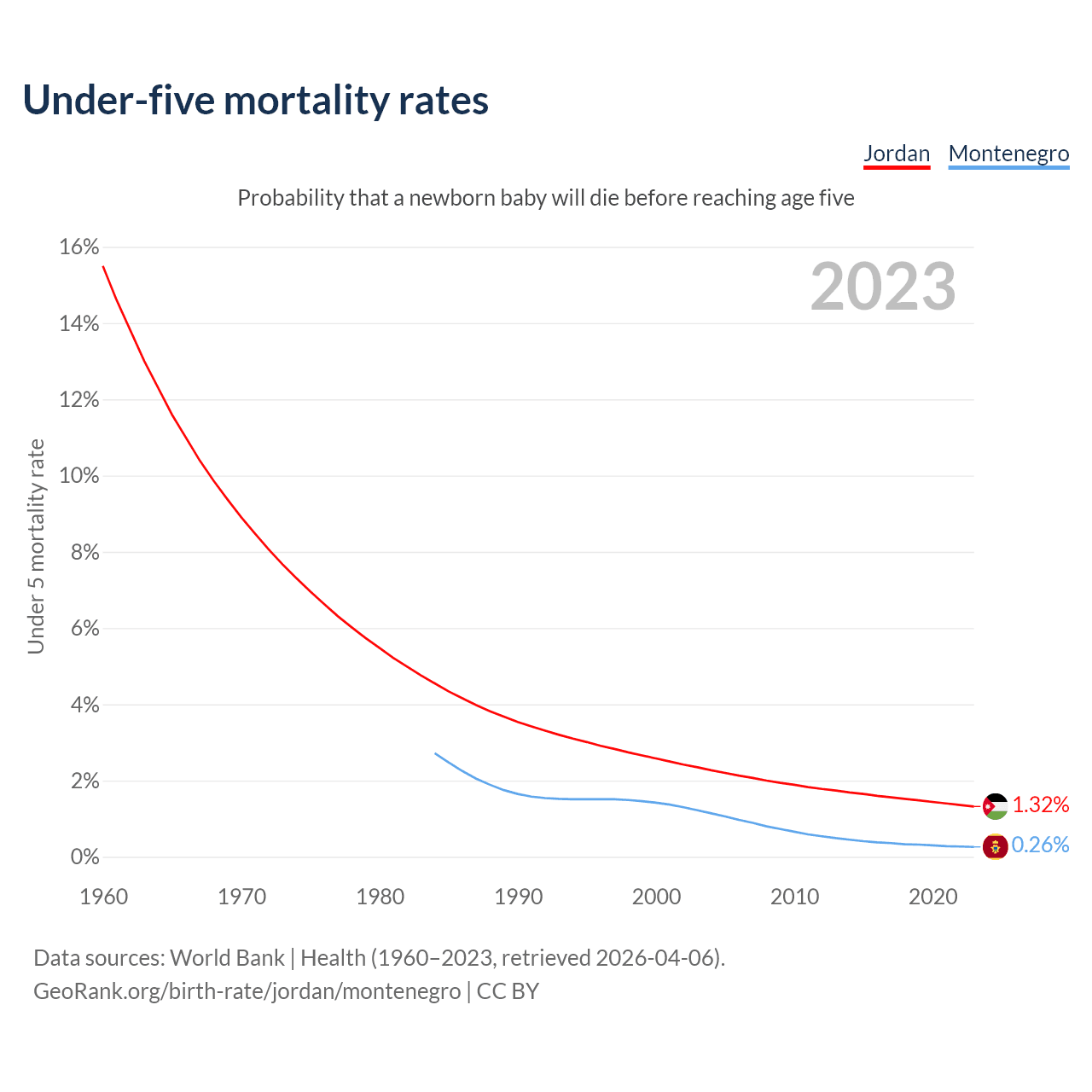 The chance that a newborn baby will die before reaching age five is 1.32% in Jordan and 0.26% in Montenegro. Above is a chart with historical data on under-five mortality rates.