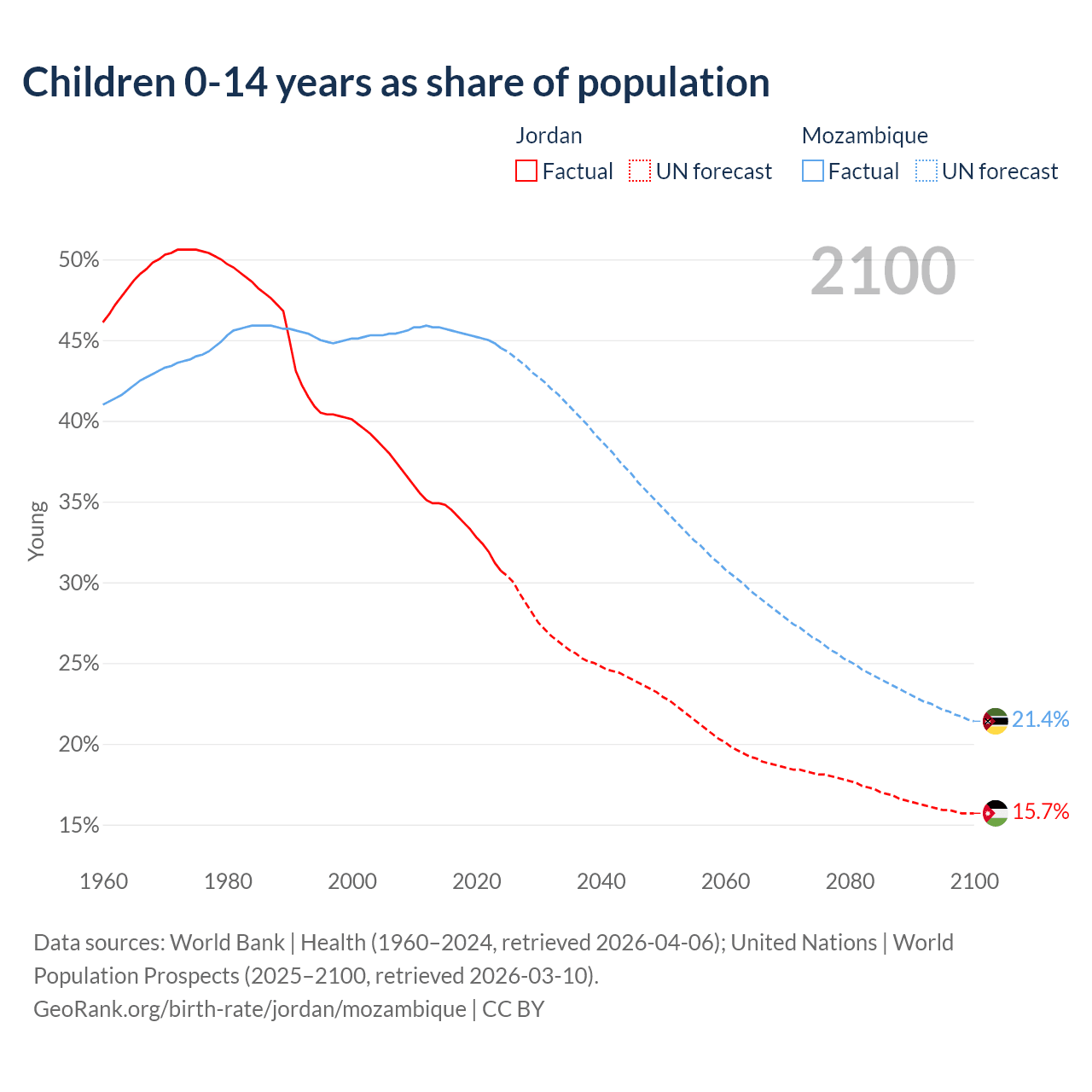 According to the latest available data on birth rates, the fertility rate in Jordan was 2.64 children per woman in 2023, compared to 4.76 in Mozambique in 2023. The replacement level is considered to be 2.1 children per woman.