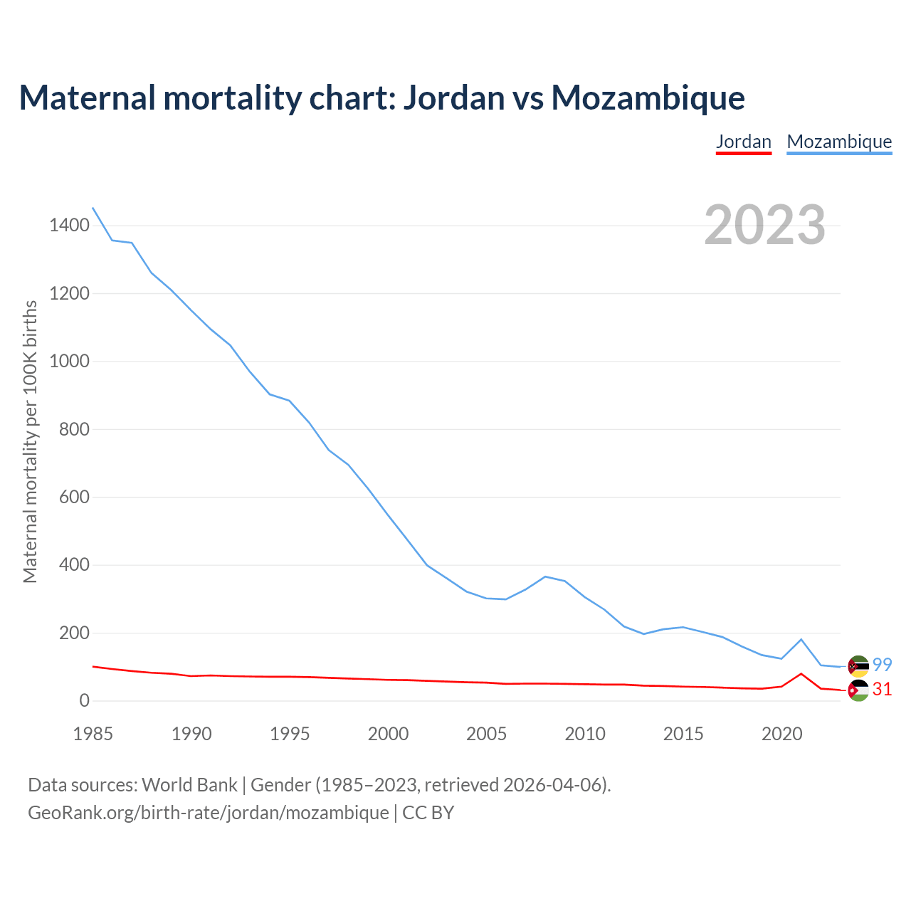 The maternal mortality rate, which is the probability of dying during childbirth or within 42 days of pregnancy termination, is 31 deaths per 100,000 live births in Jordan, compared to 99 deaths in Mozambique.