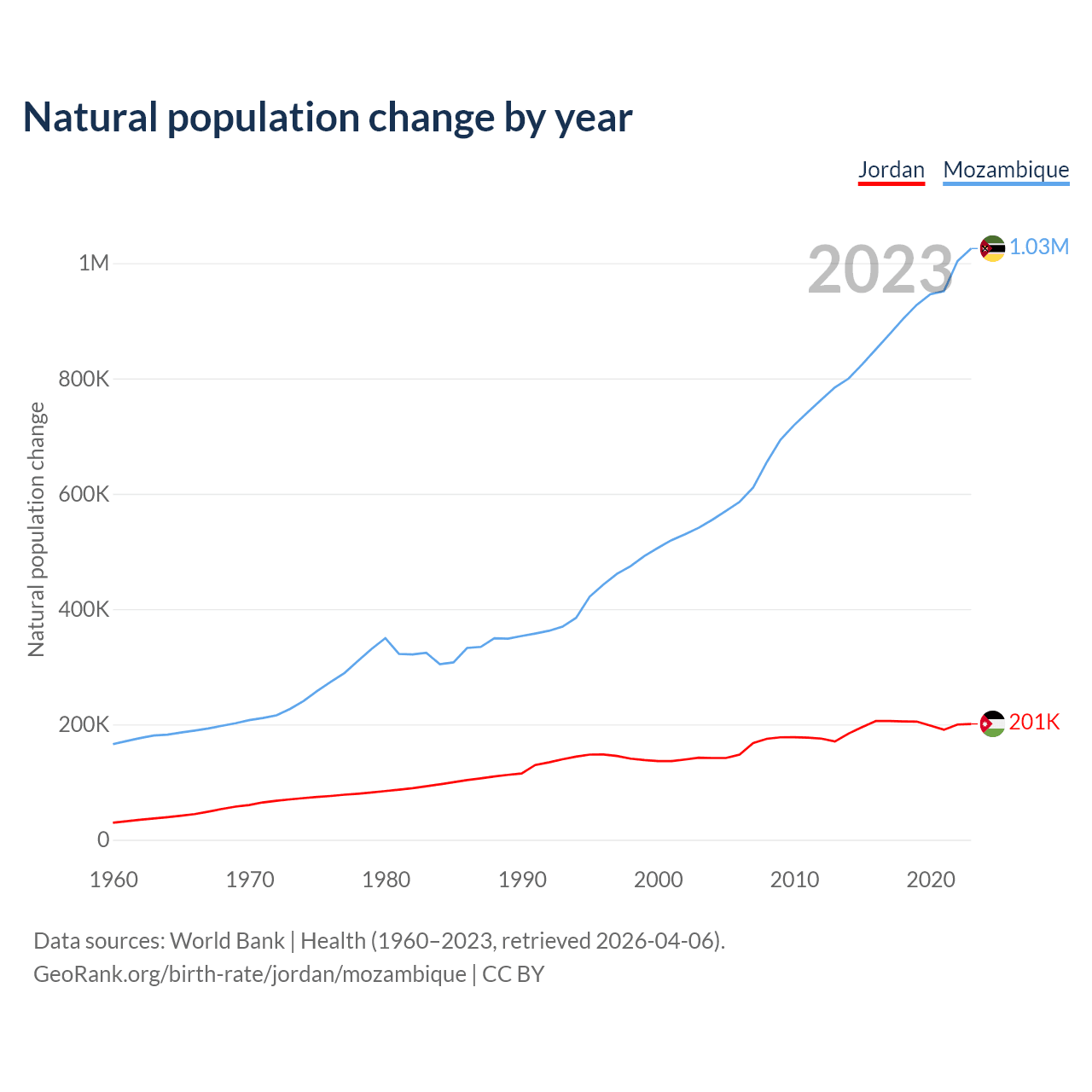 Jordan has an annual birth rate of 20.6 births per 1,000 people, compared to 37.5 for Mozambique. The average number of children a woman is expected to have during her lifetime — the fertility rate, is 2.64 in Jordan and 4.76 in Mozambique — 80.5% difference.