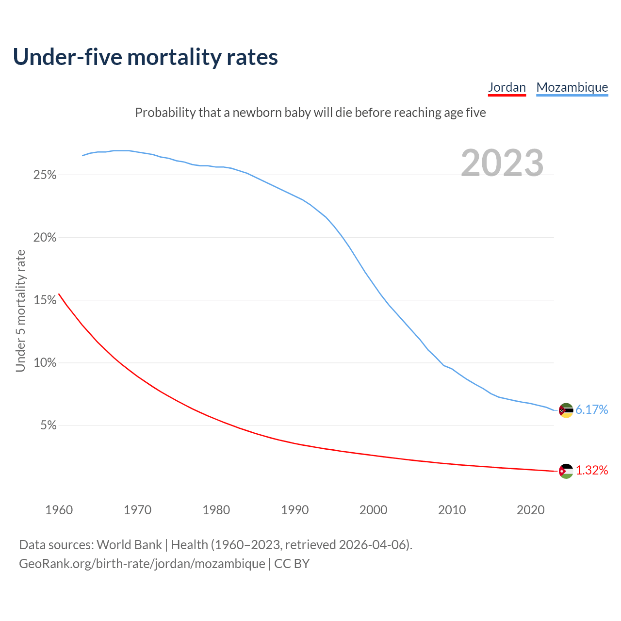 The chance that a newborn baby will die before reaching age five is 1.32% in Jordan and 6.17% in Mozambique. Above is a chart with historical data on under-five mortality rates.