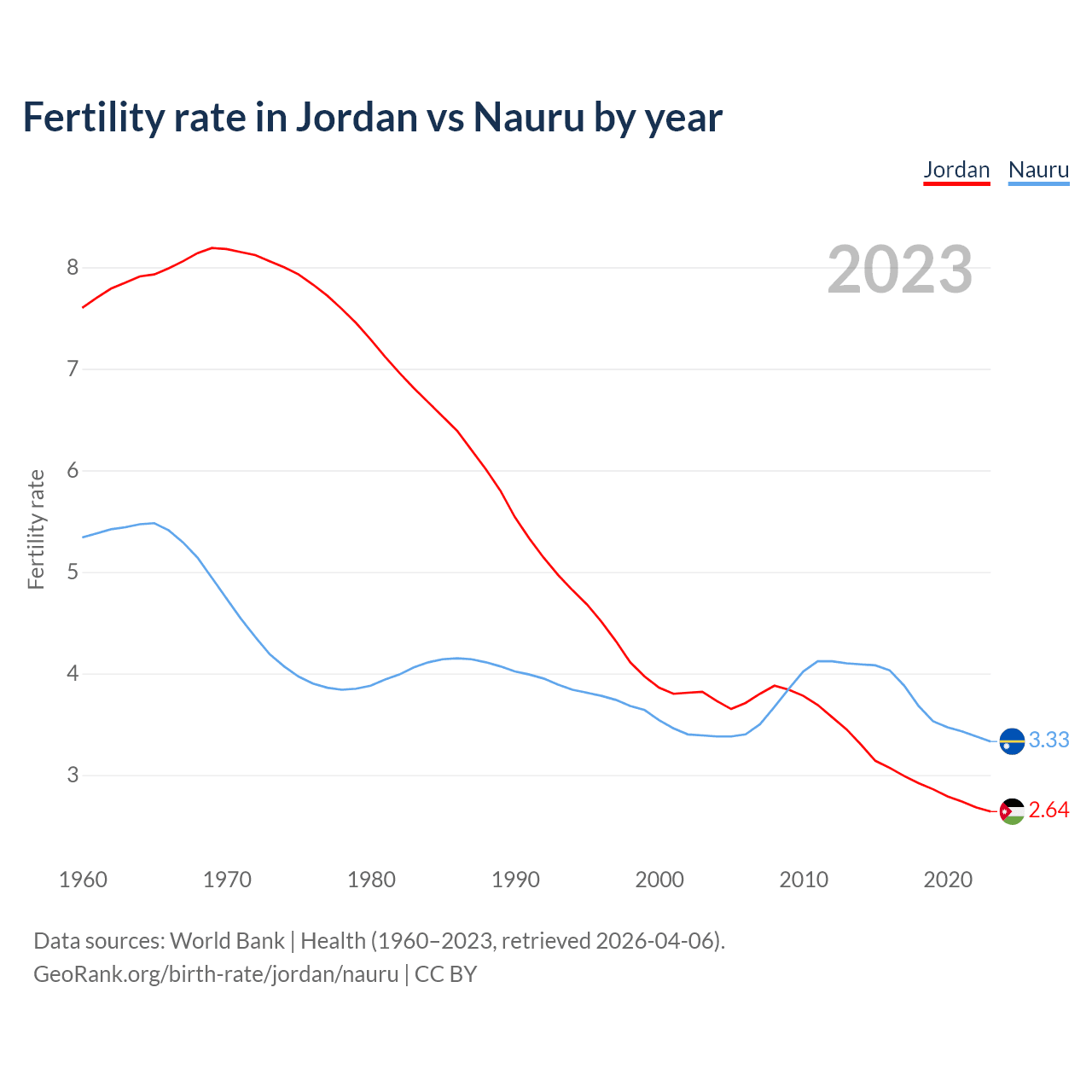 According to the latest available data on birth rates, the fertility rate in Jordan was 2.64 children per woman in 2023, compared to 3.33 in Nauru in 2023. The replacement level is considered to be 2.1 children per woman.