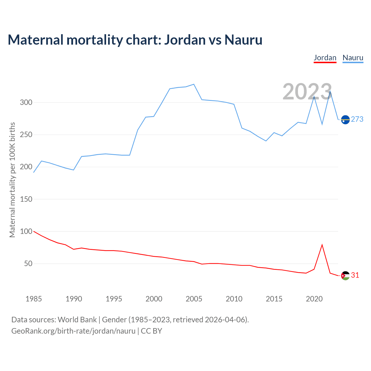 The maternal mortality rate, which is the probability of dying during childbirth or within 42 days of pregnancy termination, is 31 deaths per 100,000 live births in Jordan, compared to 273 deaths in Nauru.