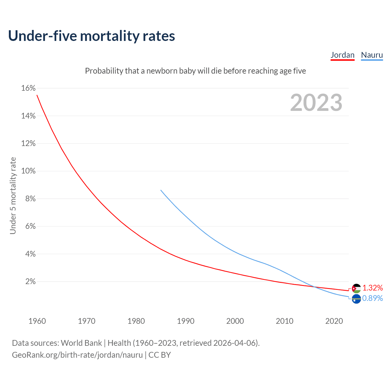 The chance that a newborn baby will die before reaching age five is 1.32% in Jordan and 0.89% in Nauru. Above is a chart with historical data on under-five mortality rates.