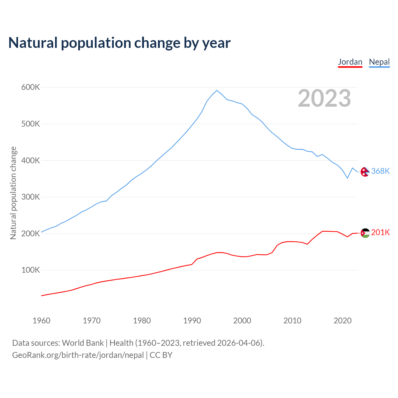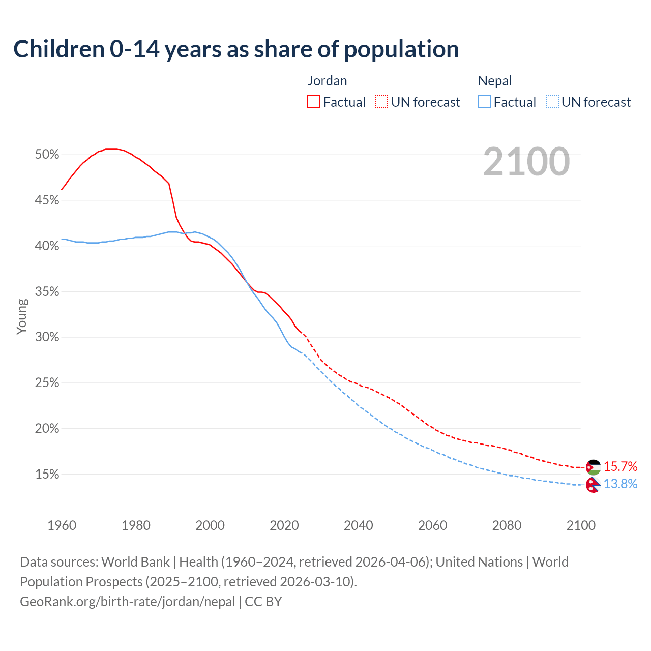 According to the latest available data on birth rates, the fertility rate in Jordan was 2.64 children per woman in 2023, compared to 1.98 in Nepal in 2023. The replacement level is considered to be 2.1 children per woman.