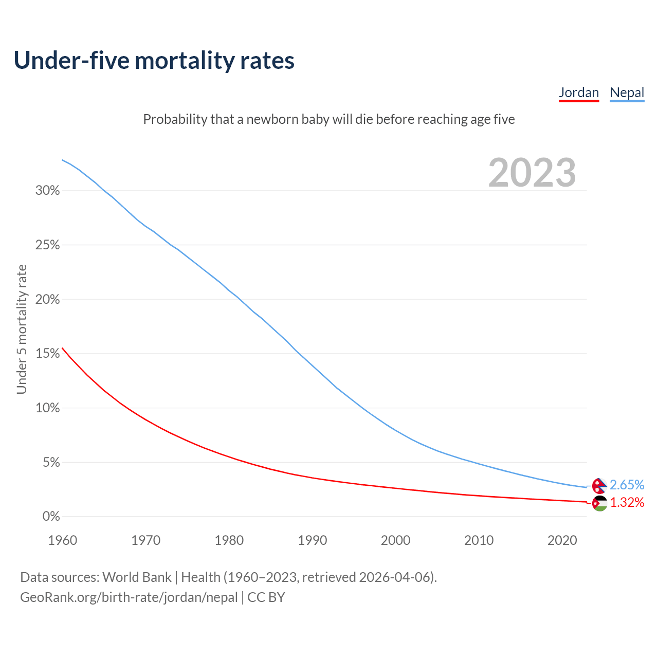 The chance that a newborn baby will die before reaching age five is 1.32% in Jordan and 2.65% in Nepal. Above is a chart with historical data on under-five mortality rates.