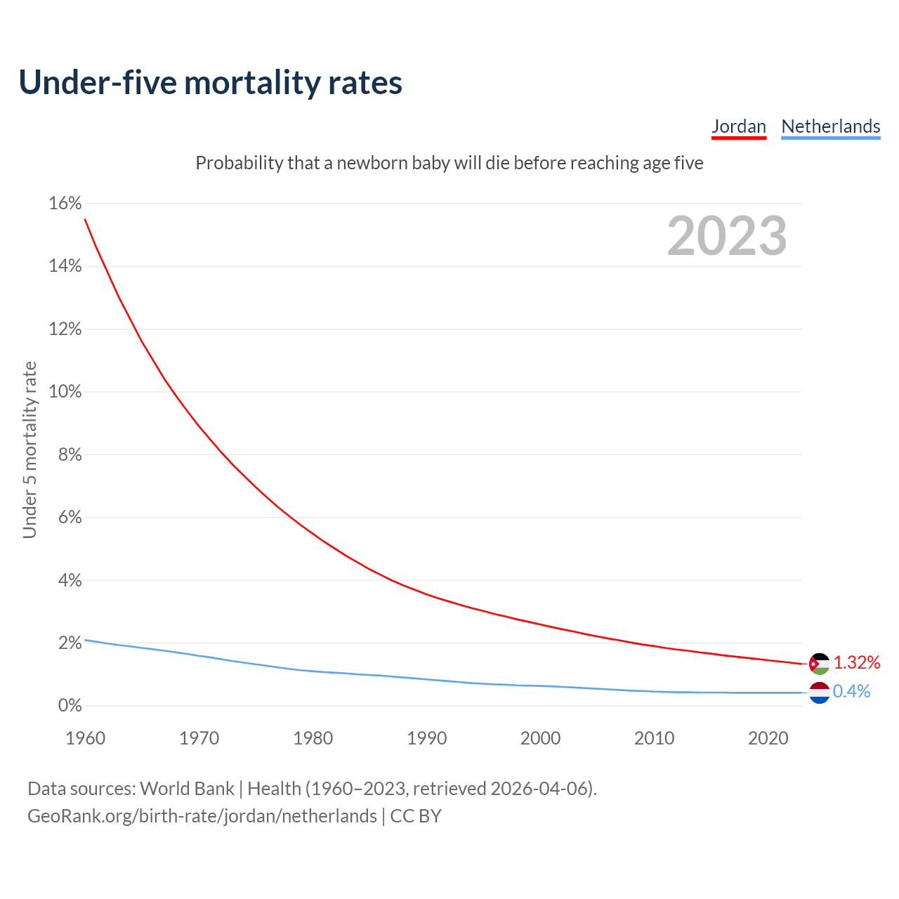 The chance that a newborn baby will die before reaching age five is 1.32% in Jordan and 0.4% in the Netherlands. Above is a chart with historical data on under-five mortality rates.