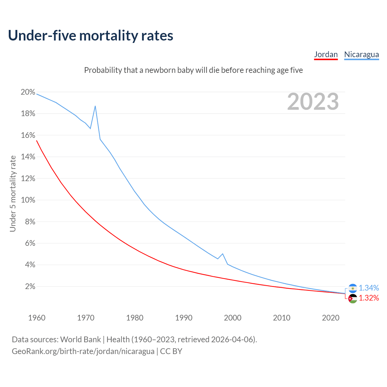 The chance that a newborn baby will die before reaching age five is 1.32% in Jordan and 1.34% in Nicaragua. Above is a chart with historical data on under-five mortality rates.