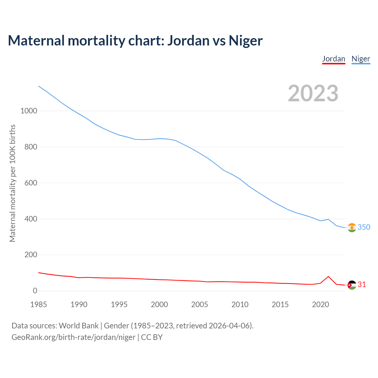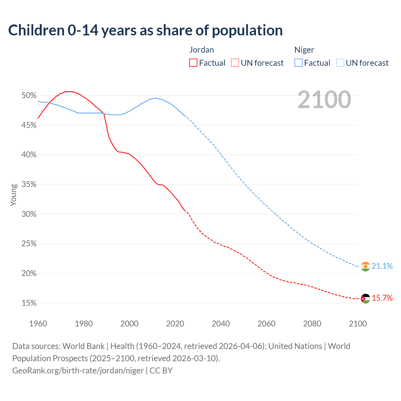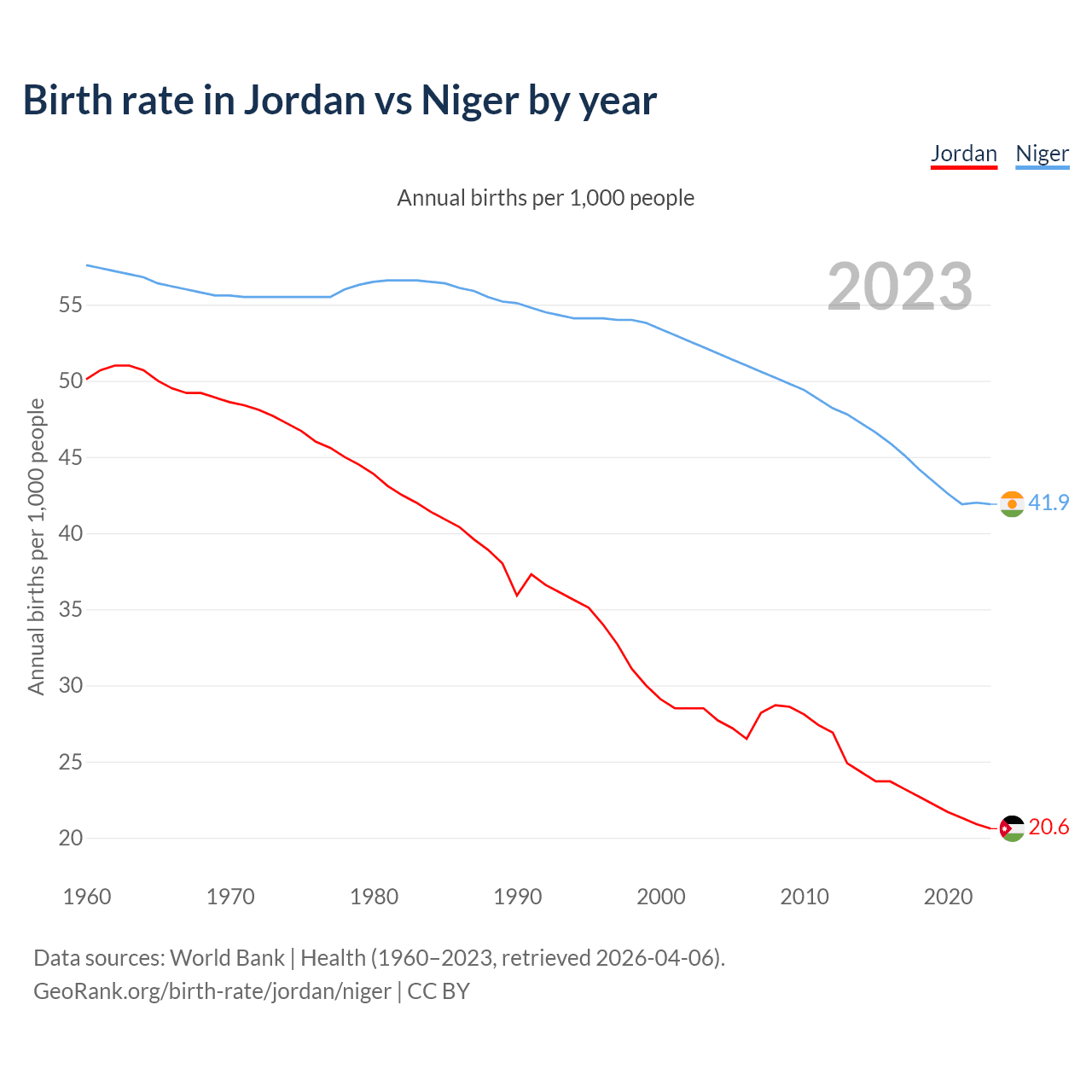Jordan has an annual birth rate of 20.6 births per 1,000 people, compared to 41.9 for Niger. The average number of children a woman is expected to have during her lifetime — the fertility rate, is 2.64 in Jordan and 6.06 in Niger — 129.7% difference.