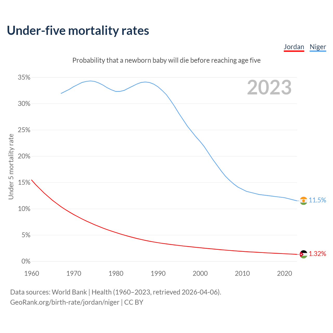 The chance that a newborn baby will die before reaching age five is 1.32% in Jordan and 11.5% in Niger. Above is a chart with historical data on under-five mortality rates.