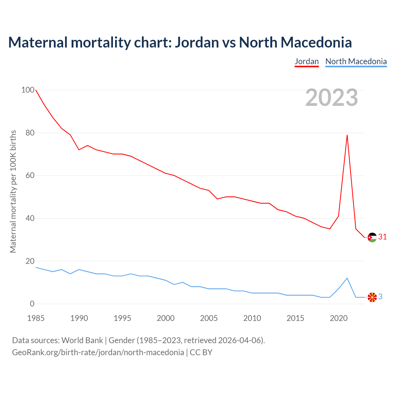The maternal mortality rate, which is the probability of dying during childbirth or within 42 days of pregnancy termination, is 31 deaths per 100,000 live births in Jordan, compared to 3 deaths in North Macedonia.