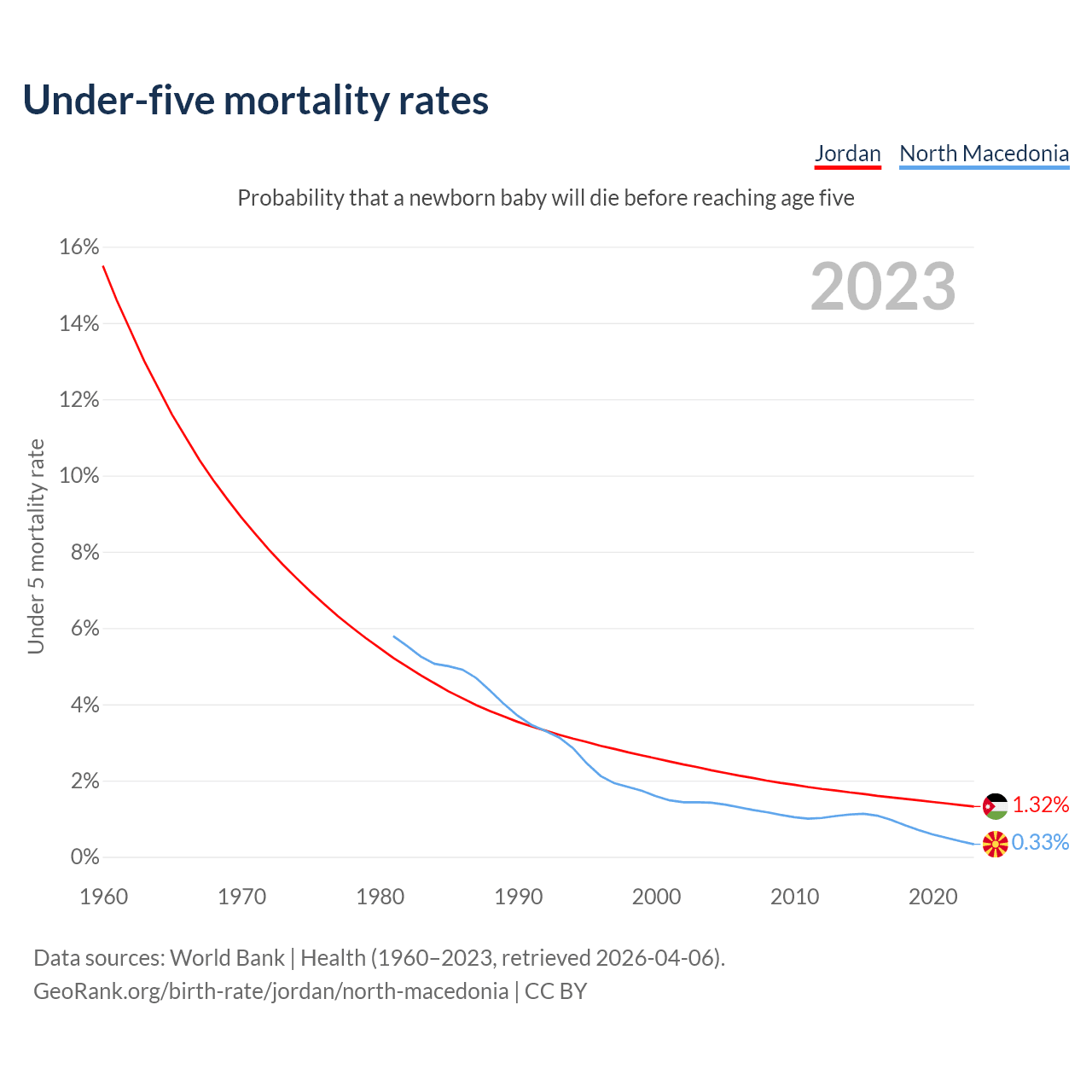 The chance that a newborn baby will die before reaching age five is 1.32% in Jordan and 0.33% in North Macedonia. Above is a chart with historical data on under-five mortality rates.