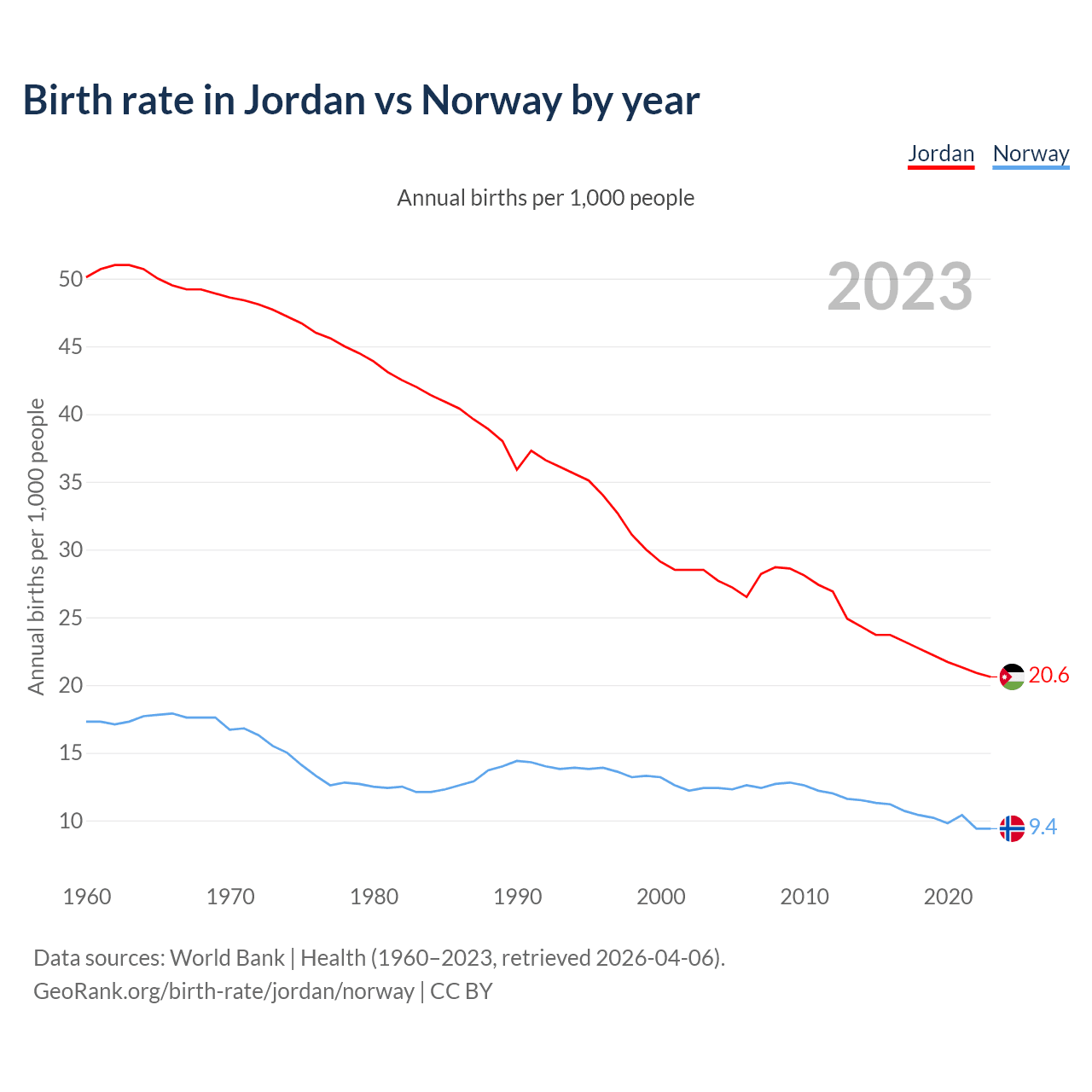 Jordan has an annual birth rate of 20.6 births per 1,000 people, compared to 9.4 for Norway. The average number of children a woman is expected to have during her lifetime — the fertility rate, is 2.64 in Jordan and 1.4 in Norway — 46.9% difference.