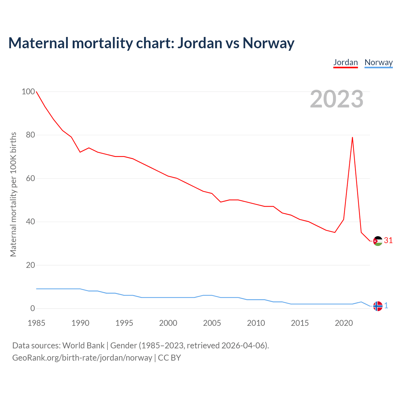 The maternal mortality rate, which is the probability of dying during childbirth or within 42 days of pregnancy termination, is 31 deaths per 100,000 live births in Jordan, compared to 1 deaths in Norway.