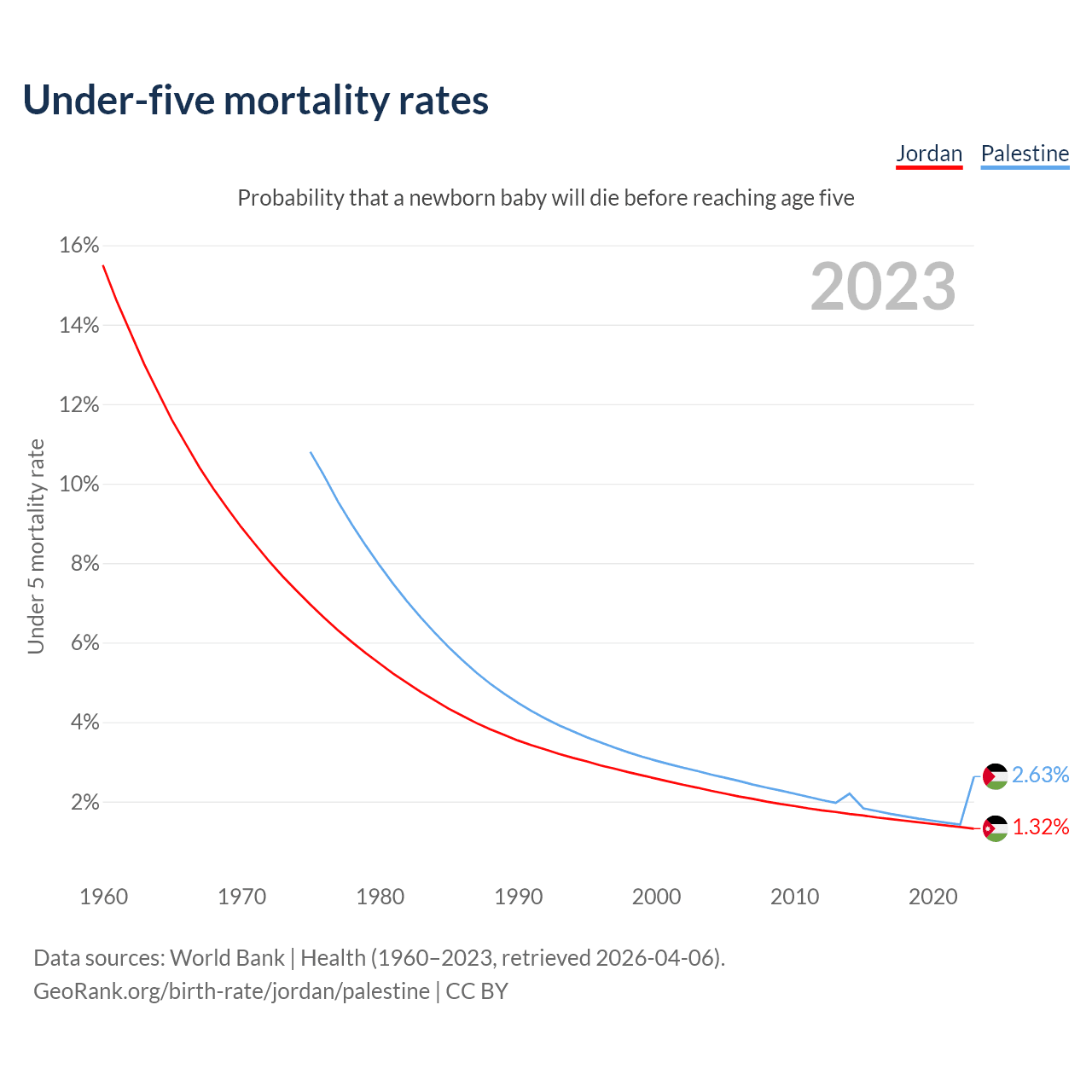 The chance that a newborn baby will die before reaching age five is 1.32% in Jordan and 2.63% in Palestine. Above is a chart with historical data on under-five mortality rates.
