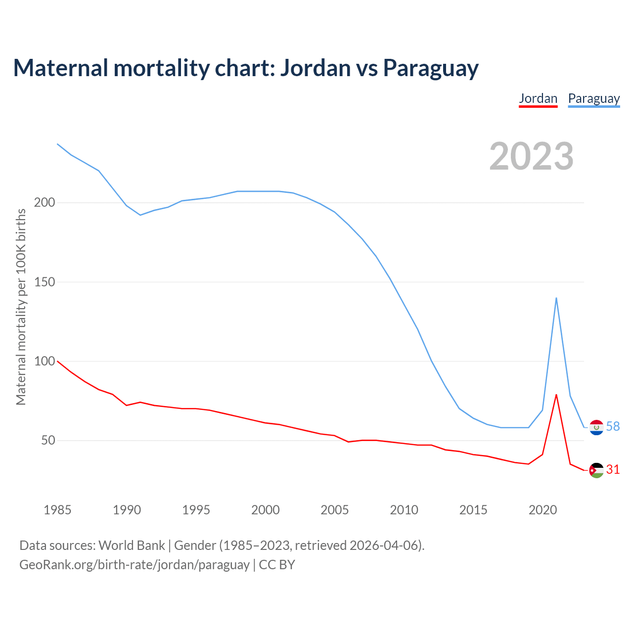 The maternal mortality rate, which is the probability of dying during childbirth or within 42 days of pregnancy termination, is 31 deaths per 100,000 live births in Jordan, compared to 58 deaths in Paraguay.