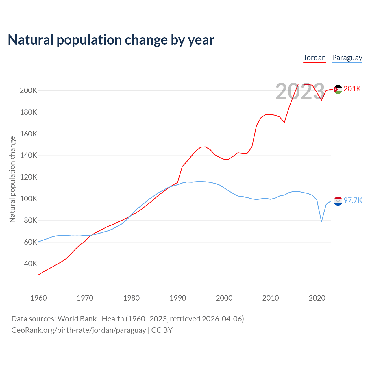 According to the latest available data on birth rates, the fertility rate in Jordan was 2.64 children per woman in 2023, compared to 2.42 in Paraguay in 2023. The replacement level is considered to be 2.1 children per woman.