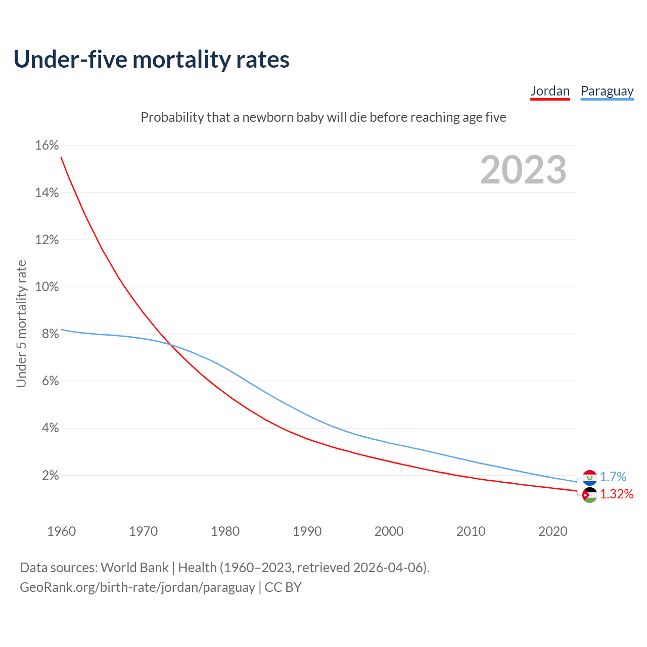 The chance that a newborn baby will die before reaching age five is 1.32% in Jordan and 1.7% in Paraguay. Above is a chart with historical data on under-five mortality rates.