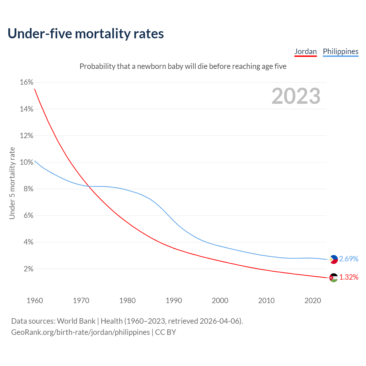 The chance that a newborn baby will die before reaching age five is 1.32% in Jordan and 2.69% in the Philippines. Above is a chart with historical data on under-five mortality rates.