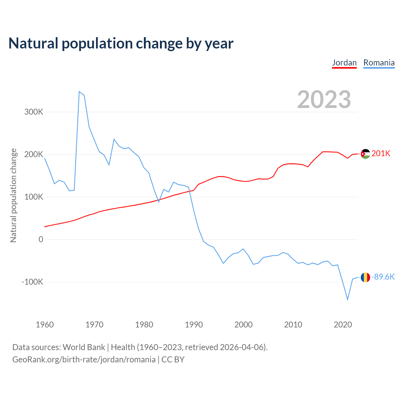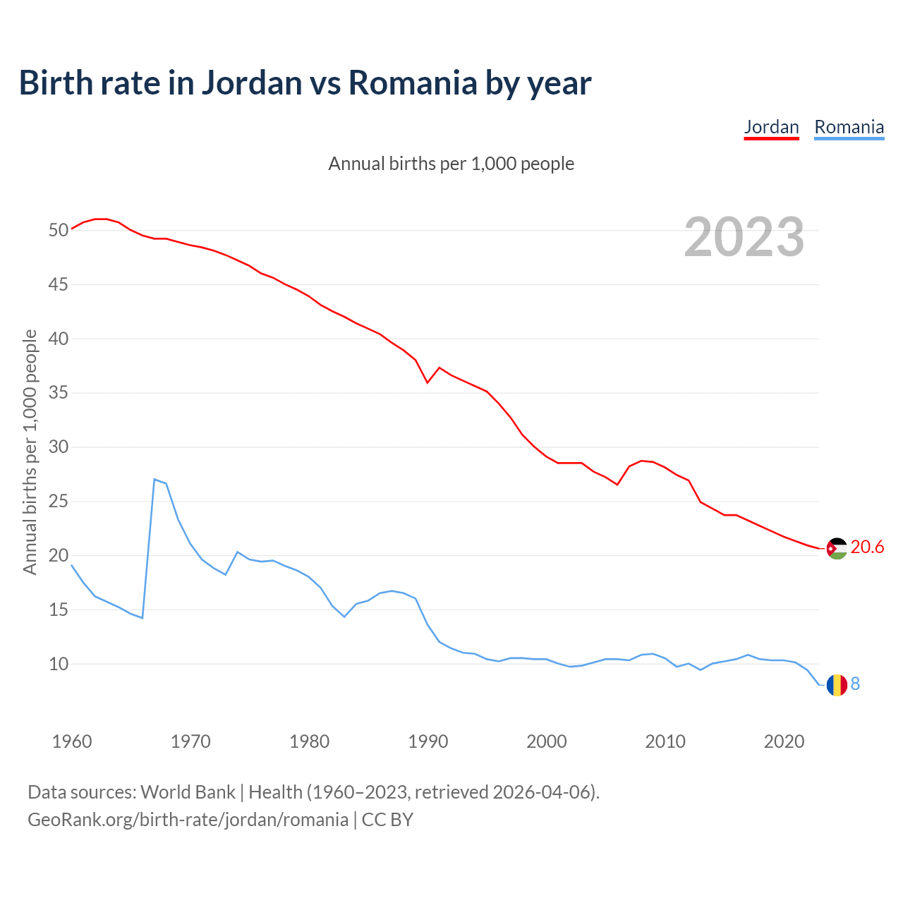 Jordan has an annual birth rate of 20.6 births per 1,000 people, compared to 8 for Romania. The average number of children a woman is expected to have during her lifetime — the fertility rate, is 2.64 in Jordan and 1.71 in Romania — 35.2% difference.