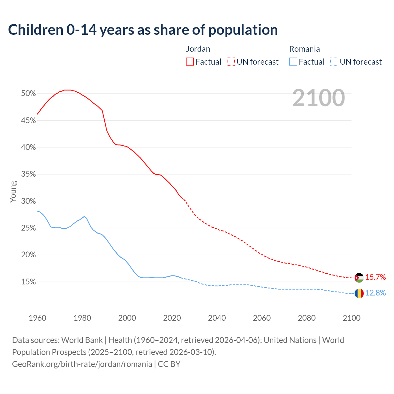 According to the latest available data on birth rates, the fertility rate in Jordan was 2.64 children per woman in 2023, compared to 1.71 in Romania in 2023. The replacement level is considered to be 2.1 children per woman.