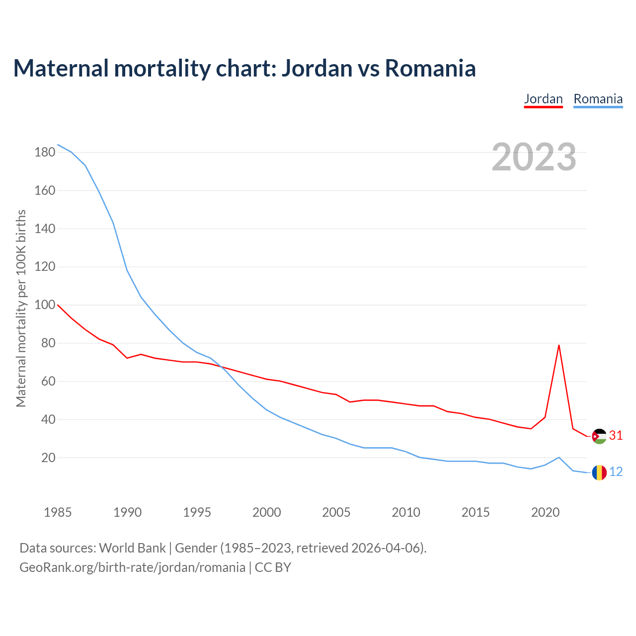 The maternal mortality rate, which is the probability of dying during childbirth or within 42 days of pregnancy termination, is 31 deaths per 100,000 live births in Jordan, compared to 12 deaths in Romania.