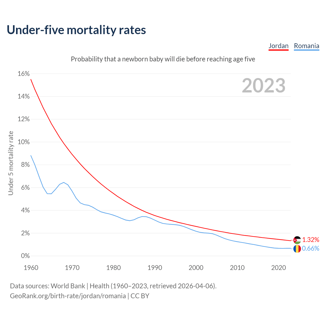 The chance that a newborn baby will die before reaching age five is 1.32% in Jordan and 0.66% in Romania. Above is a chart with historical data on under-five mortality rates.